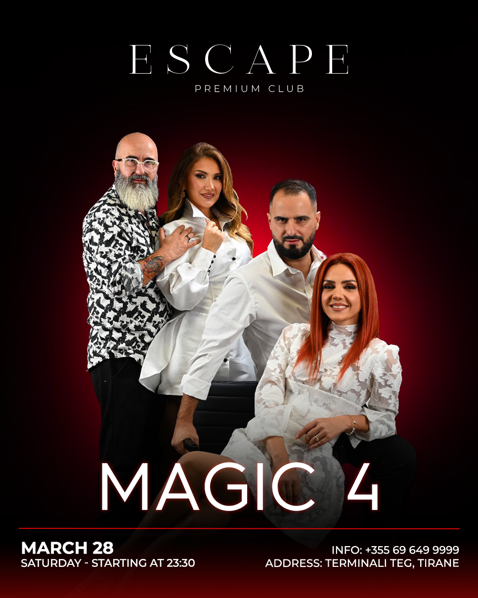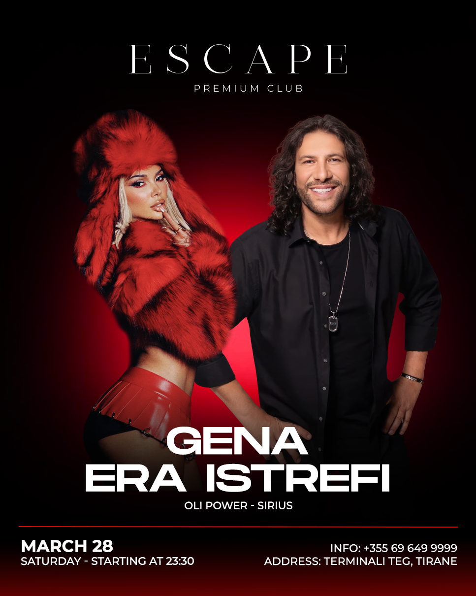 Events Events 2025This Saturday, the stage is on fire... at Escape Premium Club. Get ready for an unforgettable night ๐ฅ๐ฅ๐ฅ Era Istrefi/ Gena / Magic 4 Reservation: +355 69 649 9999
